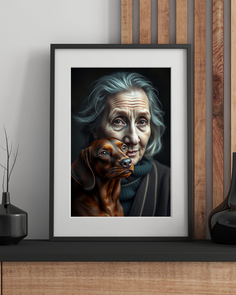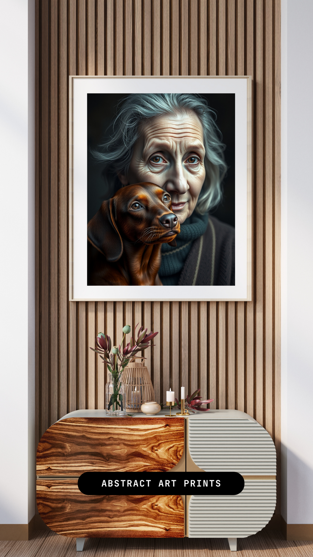 “Kindred Spirits” captures the profound, almost spiritual connection between a gentle elderly woman and her loyal dachshund—two lives intertwined through time, love, and quiet companionship. Their aligned brown eyes, blended silver hair and brown fur, and shared expression create a surreal yet tender portrait that speaks of loyalty, aging together, and soul-deep understanding. Set against a dreamy, muted background with soft earthy tones, this piece transcends typical pet art to become a visual poem of empathy, longevity, and mutual devotion. Ideal for framing in living rooms, reading nooks, or spaces that honor meaningful relationships. 🖼️ What’s Included: 5 JPEGs (300 DPI, RGB) – ideal for home printing 5 PDFs (300 DPI, CMYK) – print-ready for professional results 5 Aspect Ratios with popular sizes: • 2×3 → 4×6”, 8×12”, 12×18”, 16×24”, 24×36” • 3×4 → 6×8”, 9×12”, 12×16”, 18×24” • 4×5 → 8×10”, 11×14”, 16×20” • 1×1 → 8×8”, 12×12”, 20×20” • ISO → A5, A4, A3, A2, A1 🧾 License: Personal Use Only 💌 Created with reverence — for those who know love doesn’t need words… just presence.
