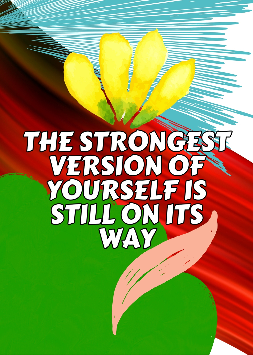 Elevate your space with this vibrant and motivational wall art print featuring the inspiring quote "The Strongest Version of Yourself Is Still on Its Way." This digital artwork combines bold typography with a dynamic design, including a superhero cape, green leaf, and yellow tulips, symbolizing growth, strength, and optimism.
