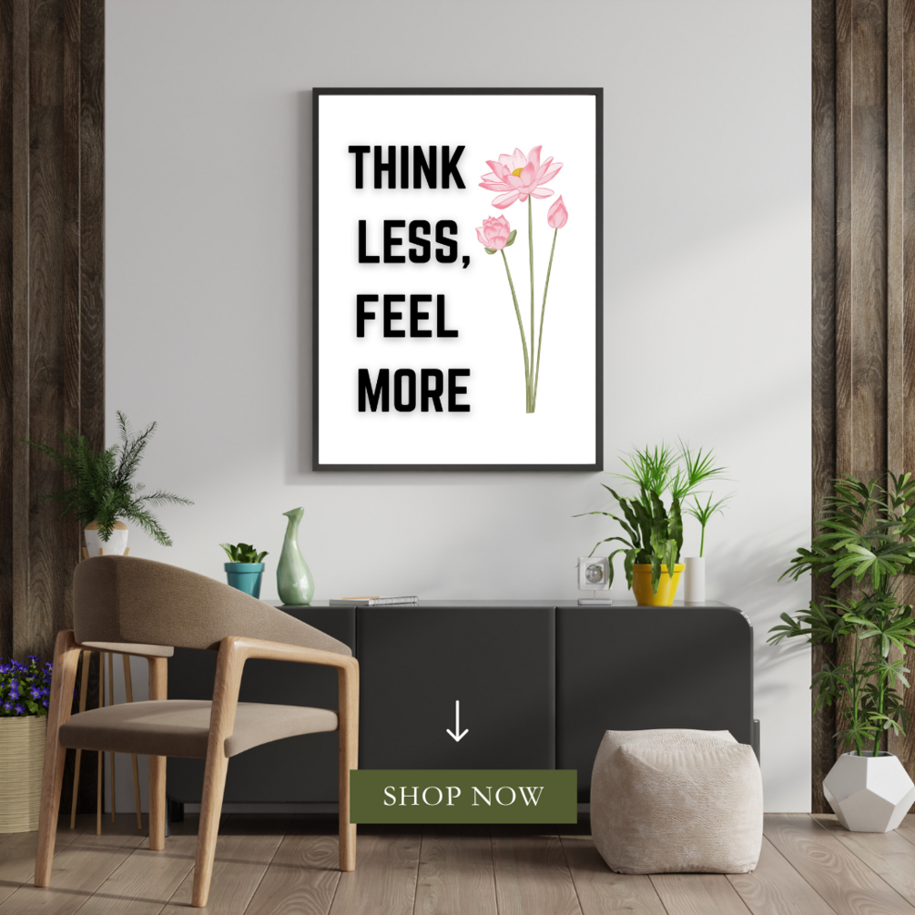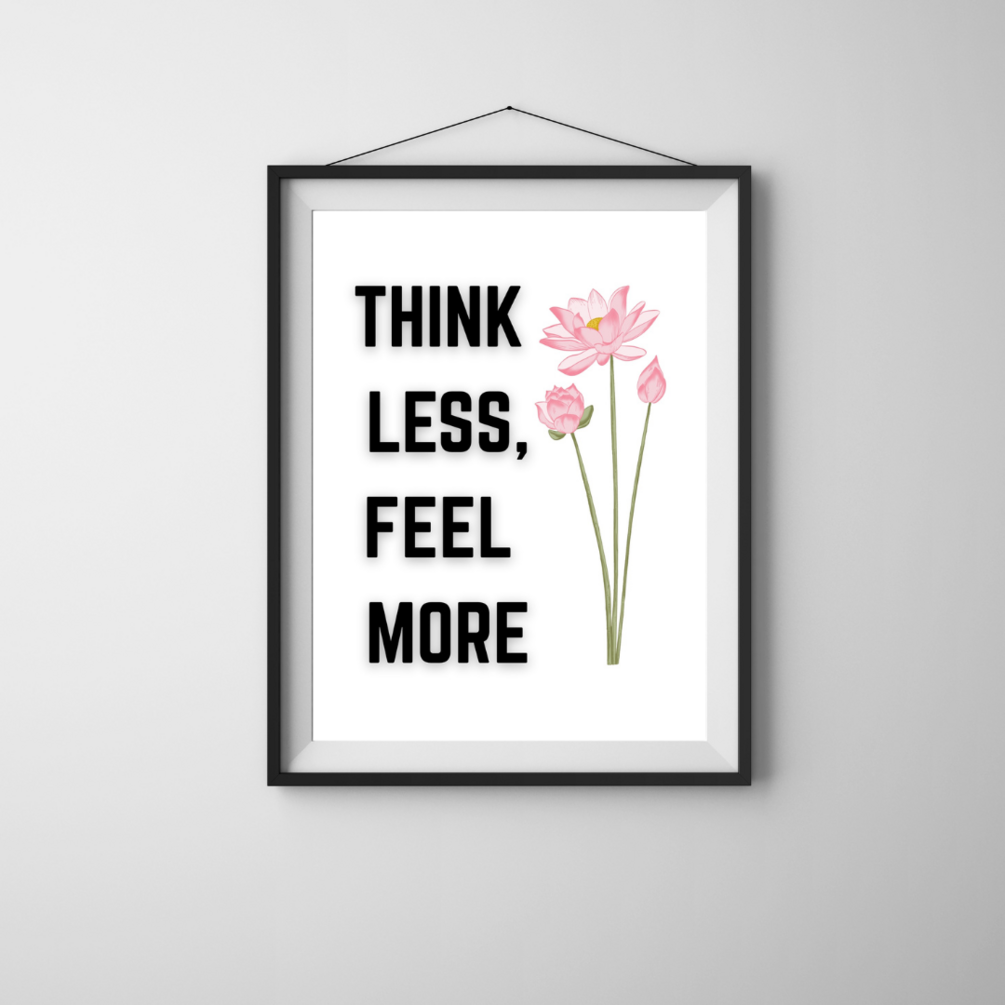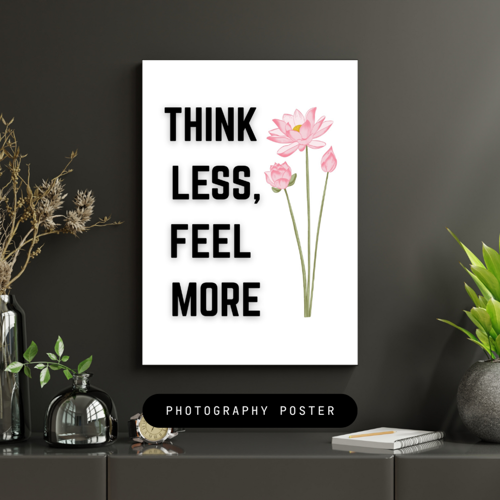 Elevate your space with this serene and minimalist wall art featuring the inspiring quote "Think Less, Feel More." Perfect for mindfulness enthusiasts, yoga studios, meditation rooms, or anyone seeking a calming reminder to embrace the present moment. The clean design combines bold typography with delicate lotus flowers, symbolizing growth, peace, and inner strength.